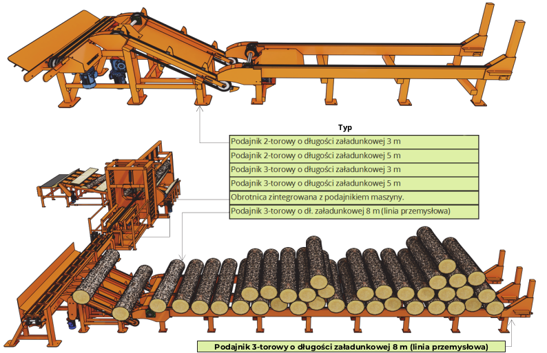 Podajnik typu LPW przystosowany jest do załadunku drewna stosowego, cienkiego tartacznego oraz średnio-wymiarowego.
