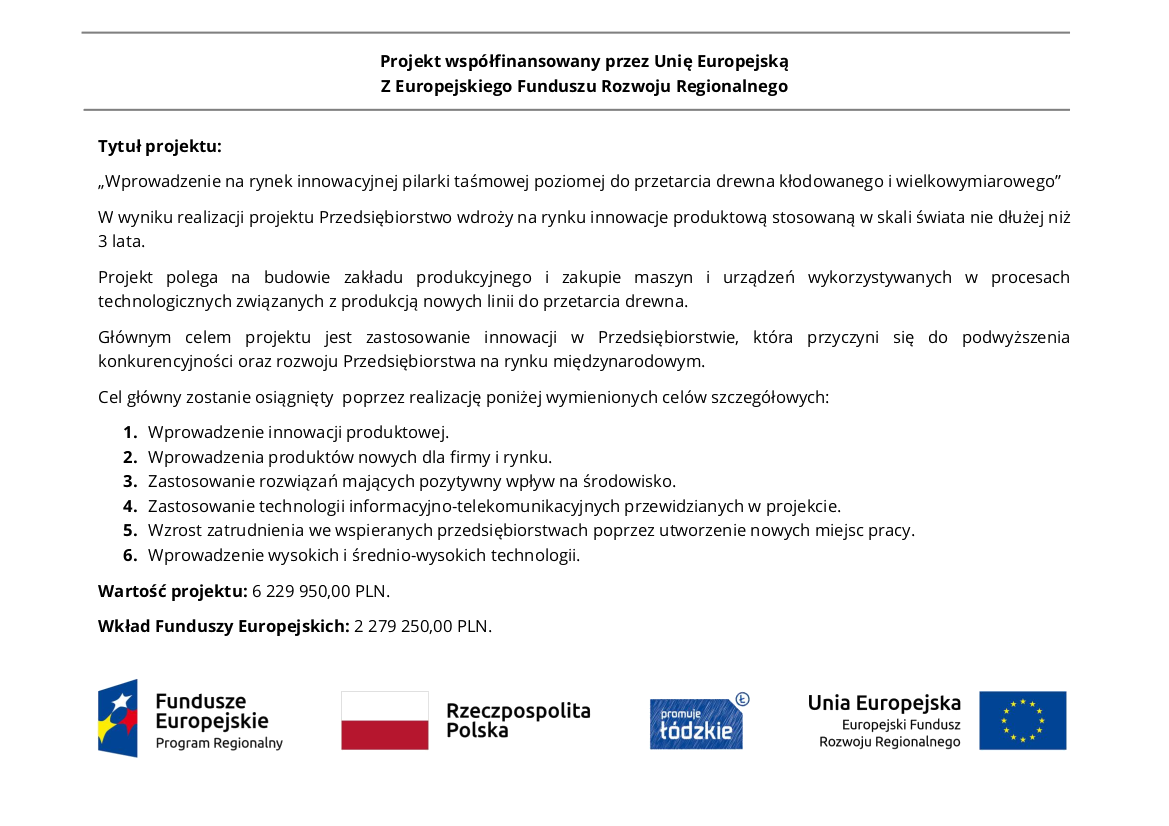 Strona główna Projekty EU Wprowadzenie na rynek innowacyjnej pilarki taśmowej poziomej do przetarcia drewna kłodowanego i wielkowymiarowego Projekty EU Wprowadzenie na rynek innowacyjnej pilarki taśmowej poziomej do przetarcia drewna kłodowanego i wielkowymiarowego